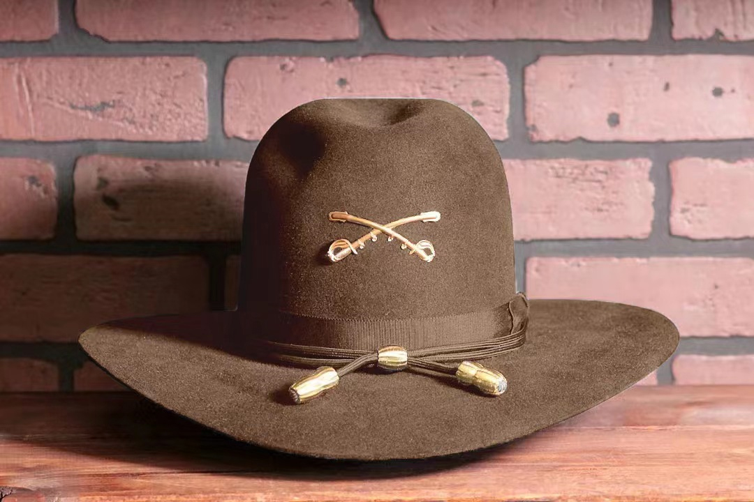The high crease crown and brim characterize the Cavalry Hat. This hat includes a black leather chin/nape strap.Our hat is shaped with authentic US Cavalry blocks, complete with the extra high crown as seen in the movie, and include the Gold Tipped Cavalry fobs and the Calvary crossed-sabers, which are made of weather-proof gold-plated metal, and then are hand woven to the crown with our special reinforced under-stitch.