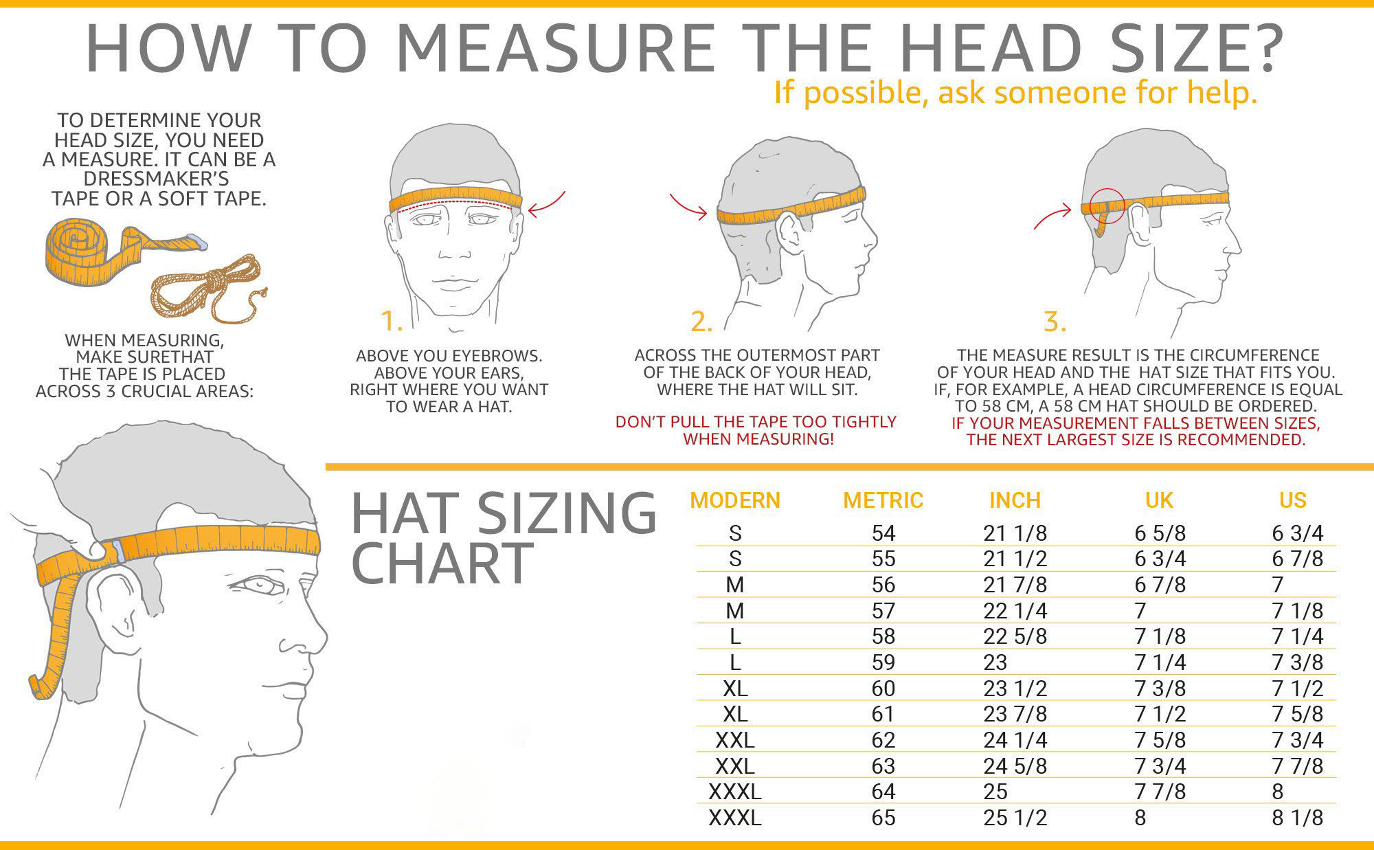 Use the table below to determine your hat size based on your measurements.
