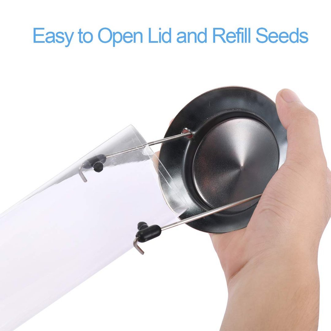 EASY TO REPLENISH AND CLEAN - our bird feeder is fitted with a lift-off lid for quick replenishment.The transparent bird-feeder is designed so that you can see exactly how many seeds are there and replenish them quickly when seeds run out.Regular cleaning will keep your bird feeder and seeds clean and attract more birds.