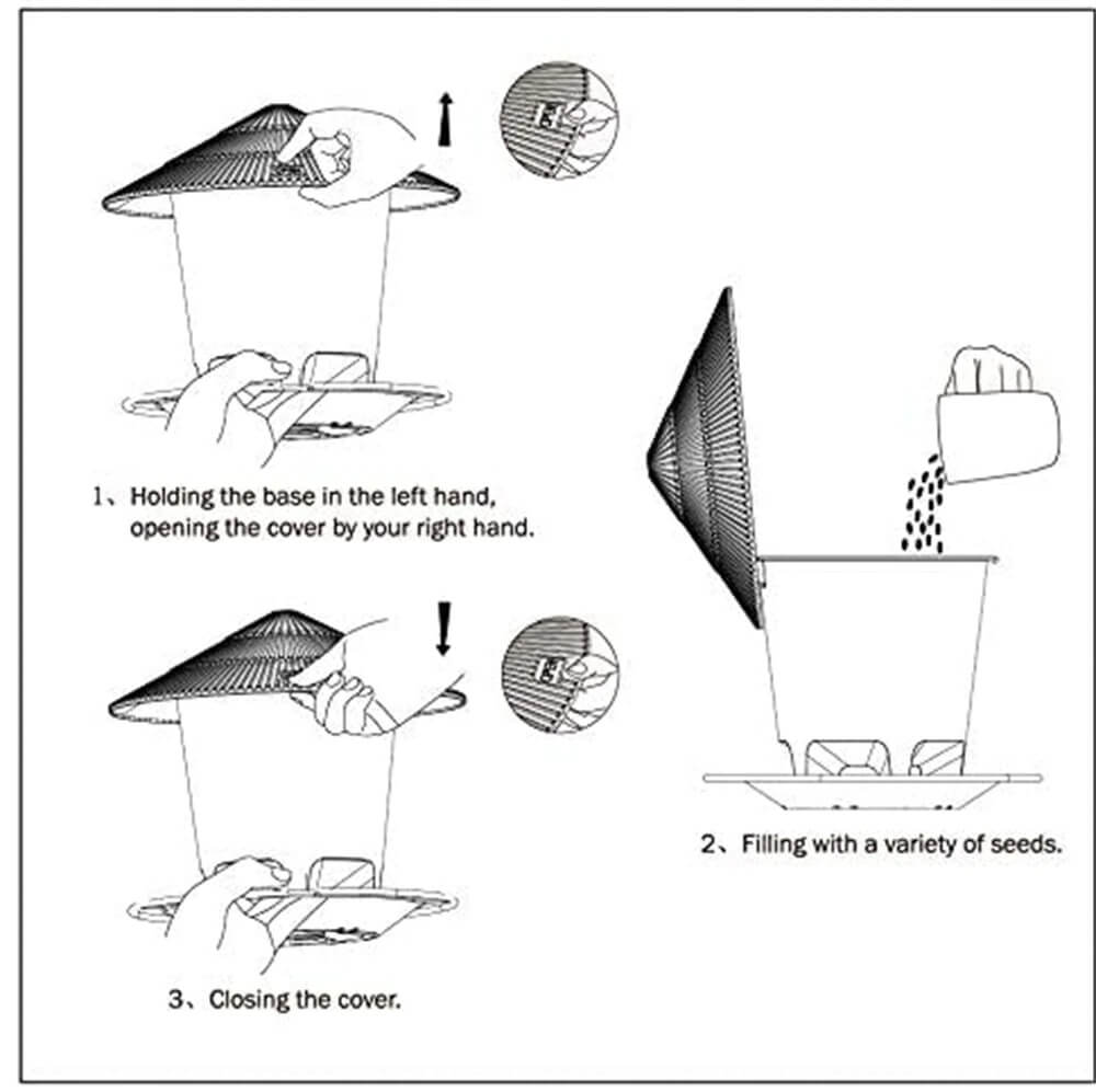 SCENES TO BE USED】Open the lid, put the wild bird seeds, sunflower seeds for birds, safflower bird seed etc, into the bird feeder, close the lid, and then hang the bird feeder under the eaves or in the garden.