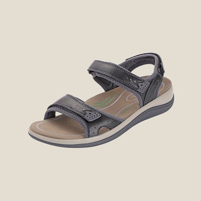 Cute, comfortable sandal. LOVE THIS SANDAL! I've had PLANTAR FASCIITIS, …VERY COMFORTABLE, WITH ALL THE SUPPORT I've come to expect from Orthofeet. The three straps are easily adjustable with Velcro fastenings, and the pewter color is attractive and versatile.