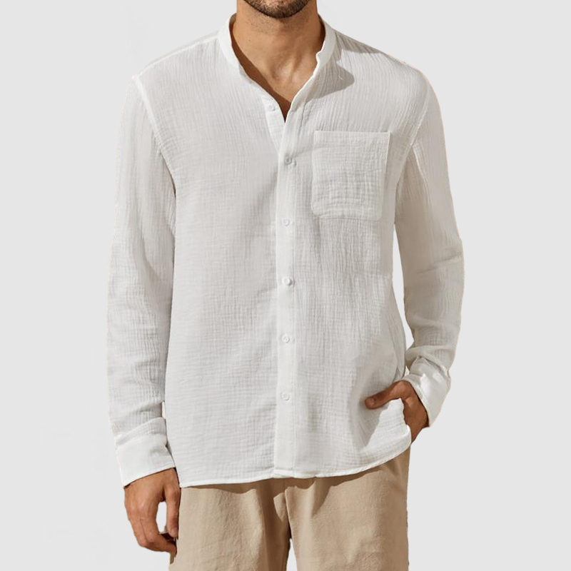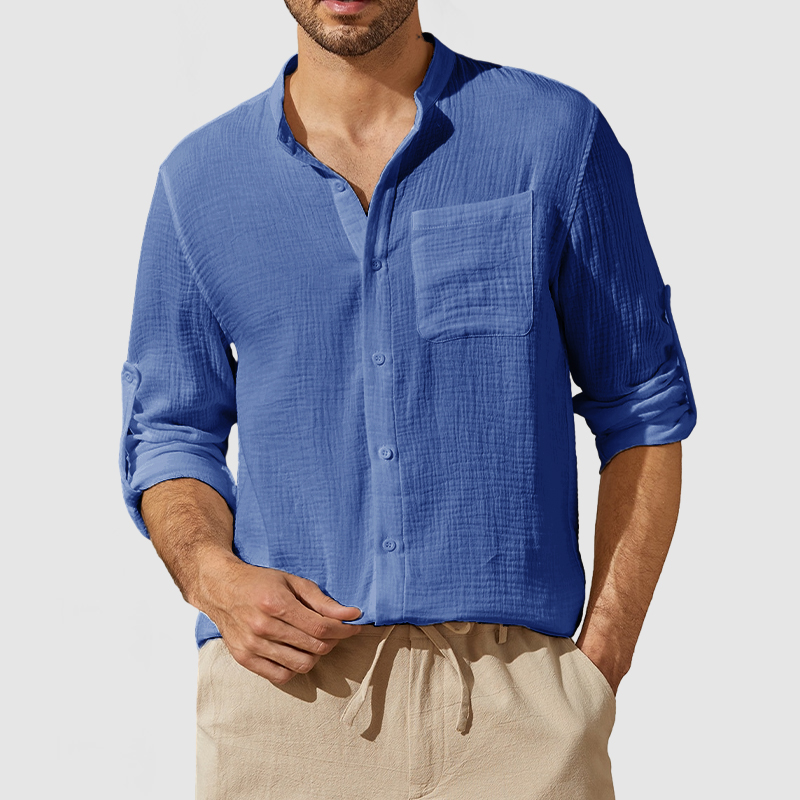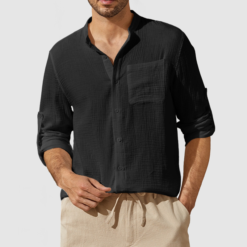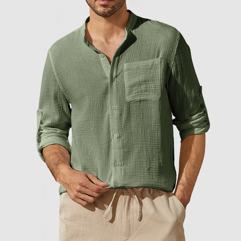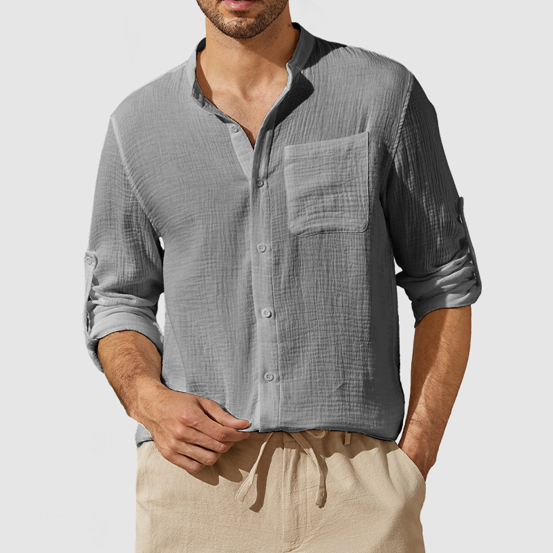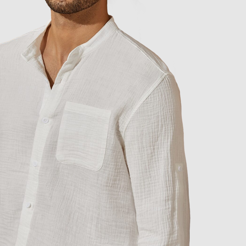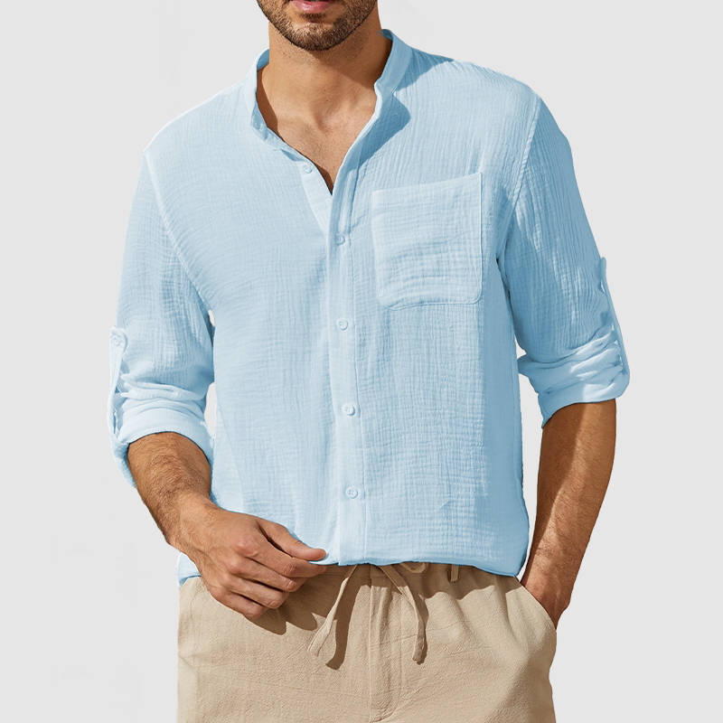 This shirt has a business-casual style element and is made from Cotton, which is extremely breathable. This shirt features a stand-up collar with chest pocket detail and the sleeves are two ways to wear, which will make this shirt less monotonous. The soft and breathable textured cotton linen fabric brings you endless comfort! Whether for outdoor sports, leisure activities or social gatherings, this shirt will keep you elegant and gentlemanly for a long time.