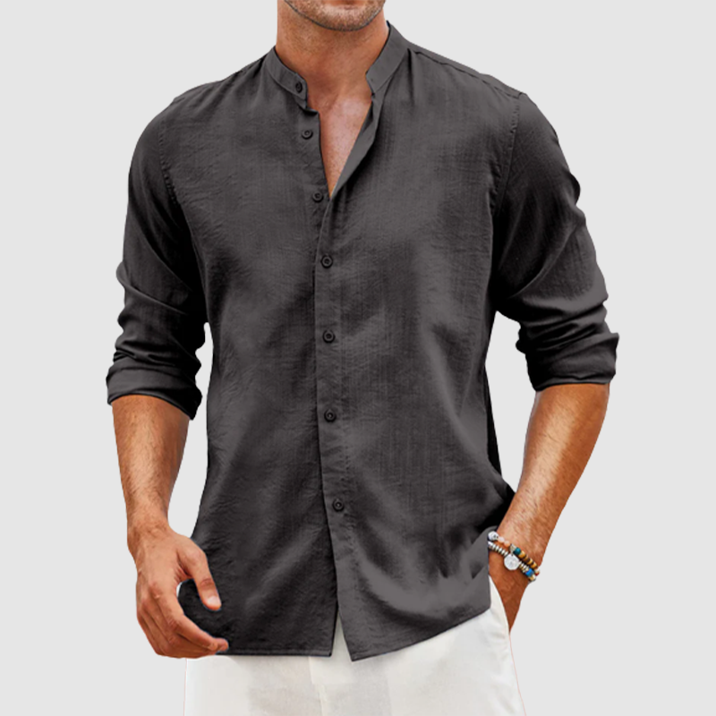 Men's linen cardigan solid color casual standing collar long sleeve shirt