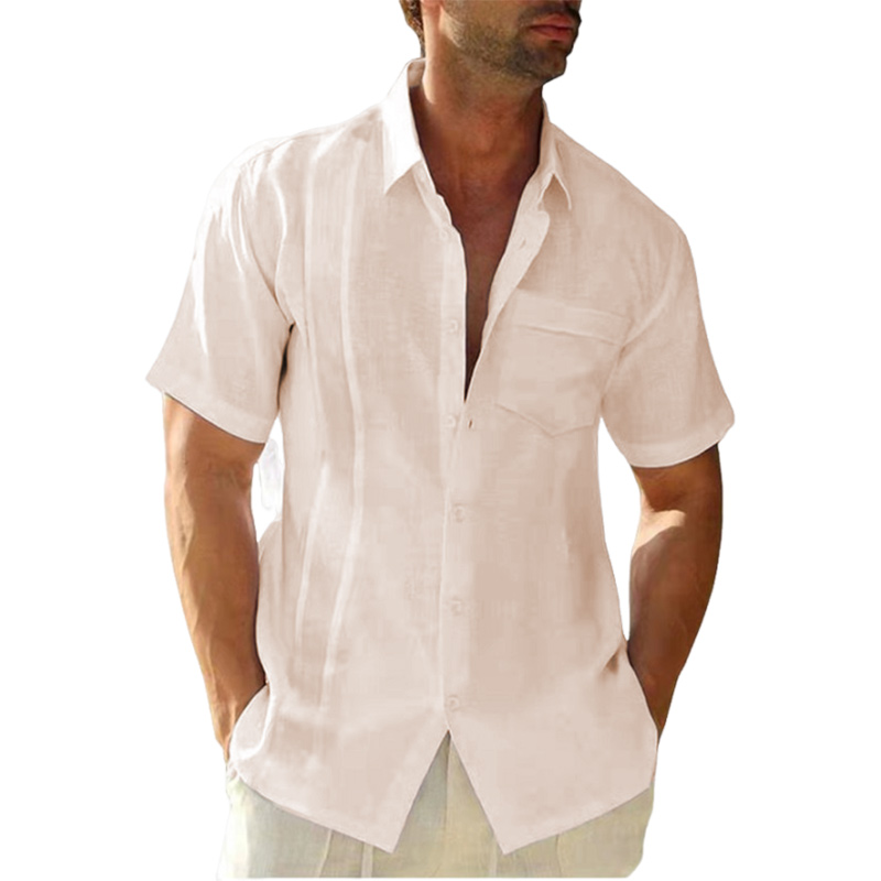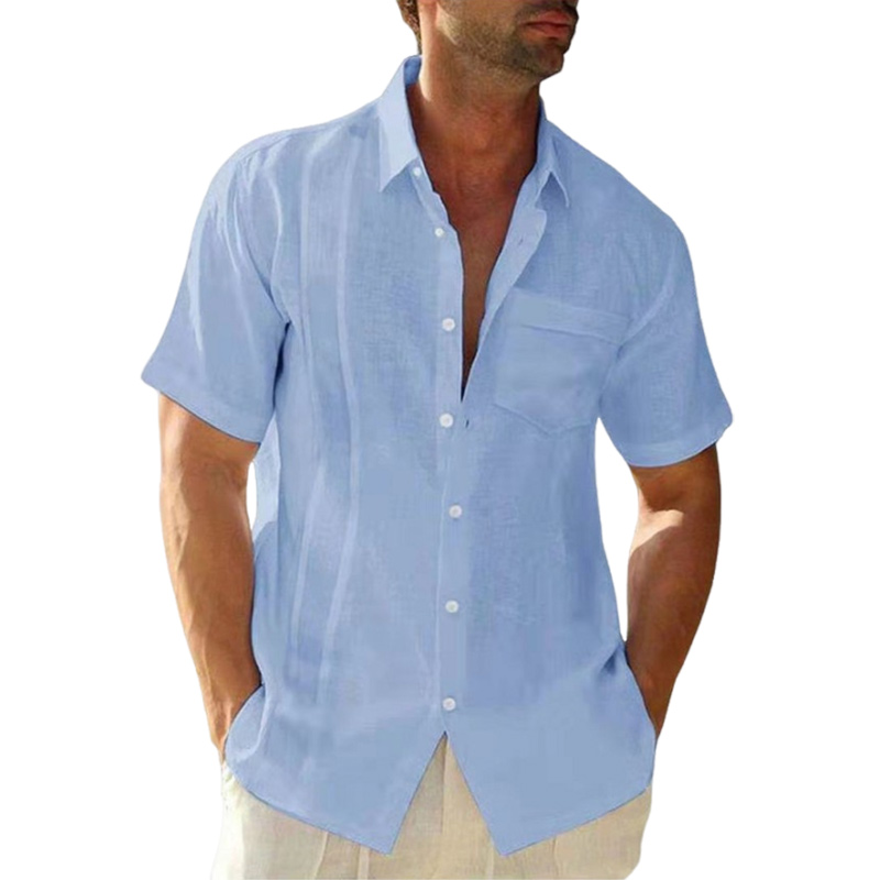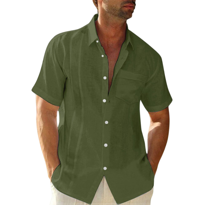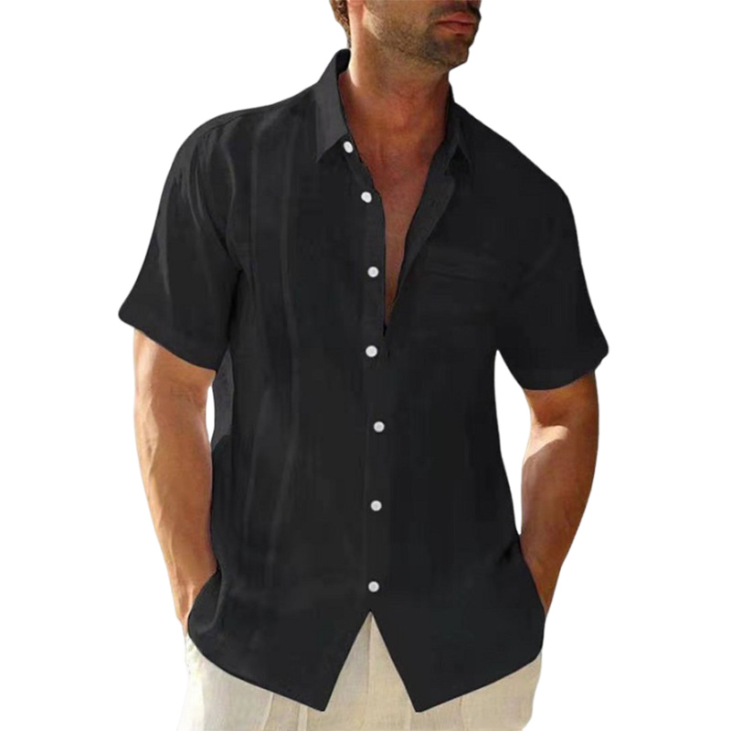 Men's summer lapel solid color cotton and linen cardigan casual short-sleeved shirt