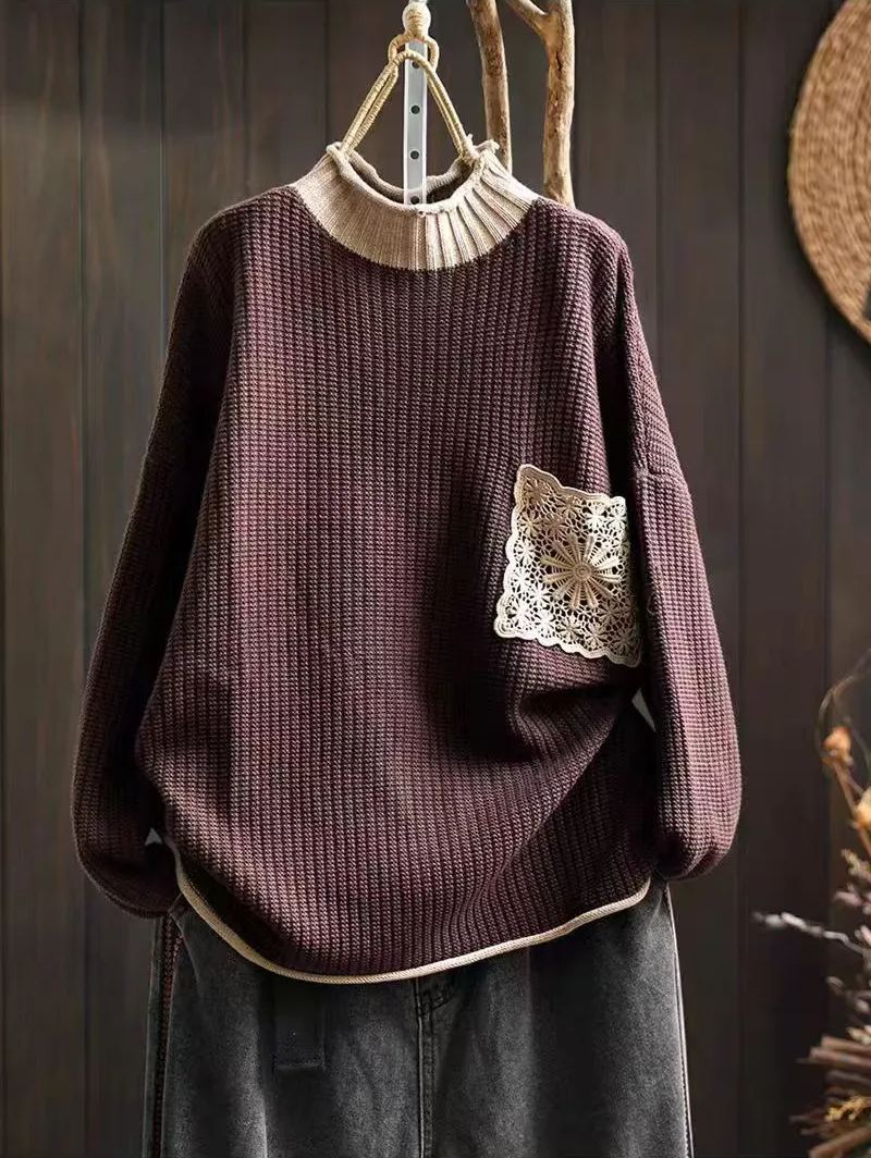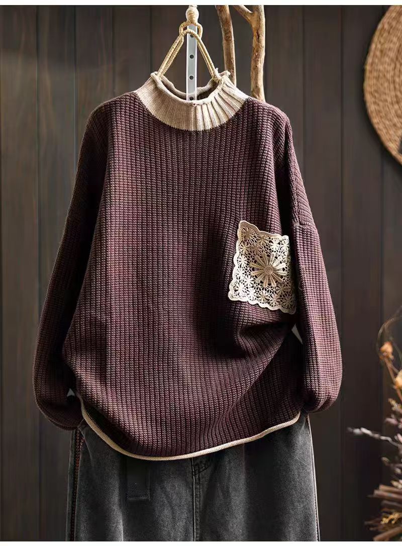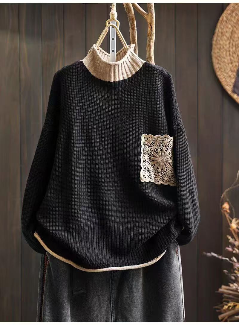 Women's Turtleneck Diamond Lace Pockets Knitted Sweater