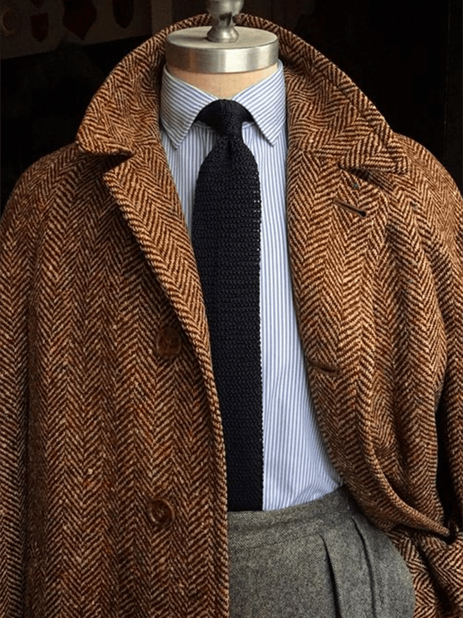 Men's Stylish Herringbone Double-Breasted Pocket Design Casual Woolen Coat