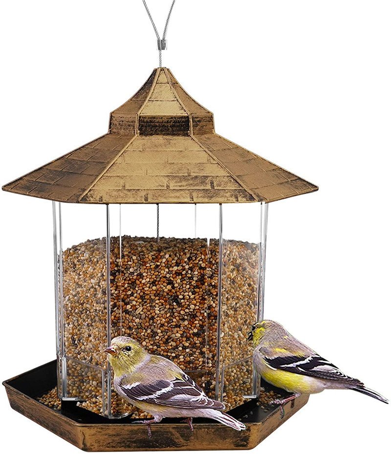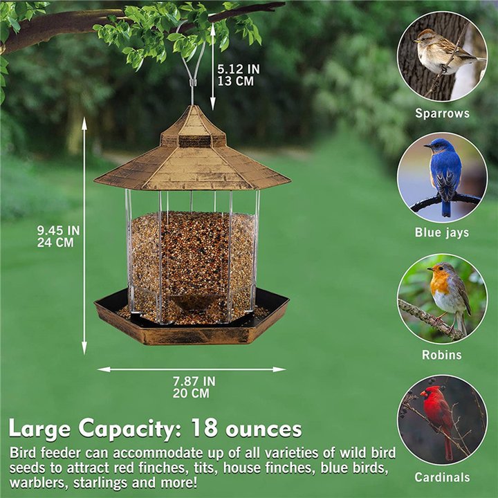 CONSIDERATE DESIGN - Comes fully assembled and ready to hang. With its hexagon shape, the bird feeder features an inclined roof to shade birds from the sun and rain. When the seeds are eaten, more seeds will naturally fill the tray.
